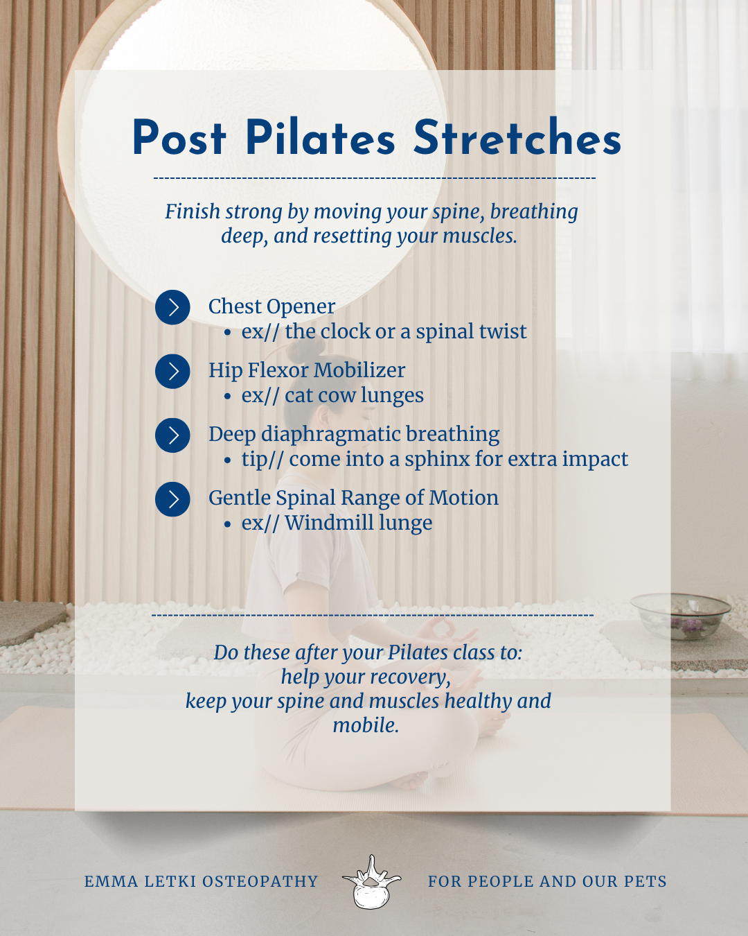 As you are moving through your full range of motion you are encouraging blood flow, supporting your diaphragm, and making space for your lungs to take deep nourishing breaths. All of these are vital for a fast recovery after a workout or a Pilates class.